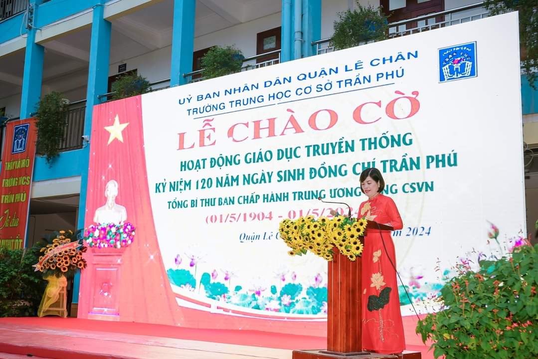Thực hiện hướng dẫn số 84-HD/BTGTW, ngày 28/3/2024 của Ban tuyên giáo Thành ủy Hải Phòng, hướng dẫn số 30-HD/QU, ngày 03/4/2024 của Quận ủy Lê Chân về việc hướng dẫn tuyên truyền Kỉ niệm 120 năm ngày sinh đồng chí Trần Phú, Tổng bí thư Ban Chấp hành Trung ương Đảng Cộng sản Việt Nam (01/5/1904 - 01/5/2024), trong chiều ngày 22/4/2024, Trường THCS Trần Phú - quận Lê Chân long trọng tổ chức Lễ chào cờ, hoạt động giáo dục truyền thống cho 100% cán bộ, giáo viên, học sinh tại đơn vị. Chương trình gồm 3 phần: